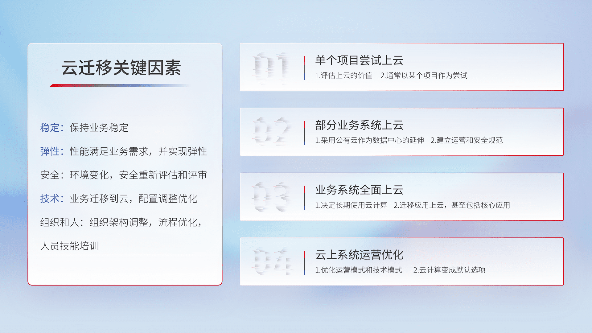 结合实际业务,,从规划设计、、、云平台选型、、、、云原生改造、、、数据迁移、、、、集成交付,,,迁移全过程为客户识别最佳上云路径,,做好风险识别管理,,,设计网络架构、、身份权限、、安全审计合规、、操作审计、、、日志审计、、监控告警策略、、、多站点容灾设计等,,,对云上基础设施进行整体规划,,提升IT治理水平,,,,以满足弹性、、、高可用、、、、高性能的需求。。。