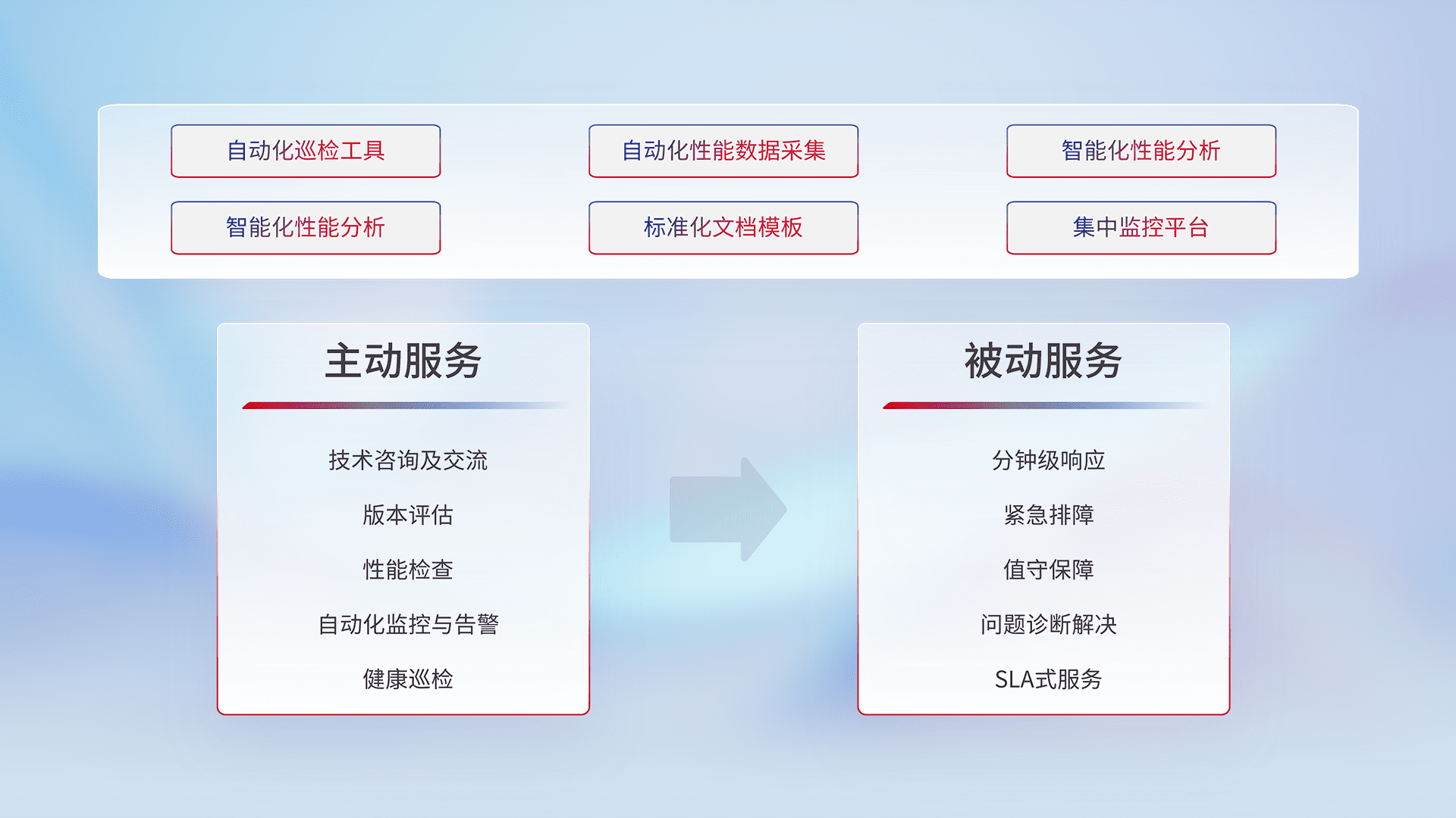 智能化工具和标准化文档,,,保障服务质量,,,提供主动服务(包含技术咨询、、、版本评估、、性能检查、、自动化监控与告警、、健康巡检)和被动服务包含(分钟级响应、、紧急排障、、、、值守保障、、问题诊断解决、、、SLA服务)。。。。